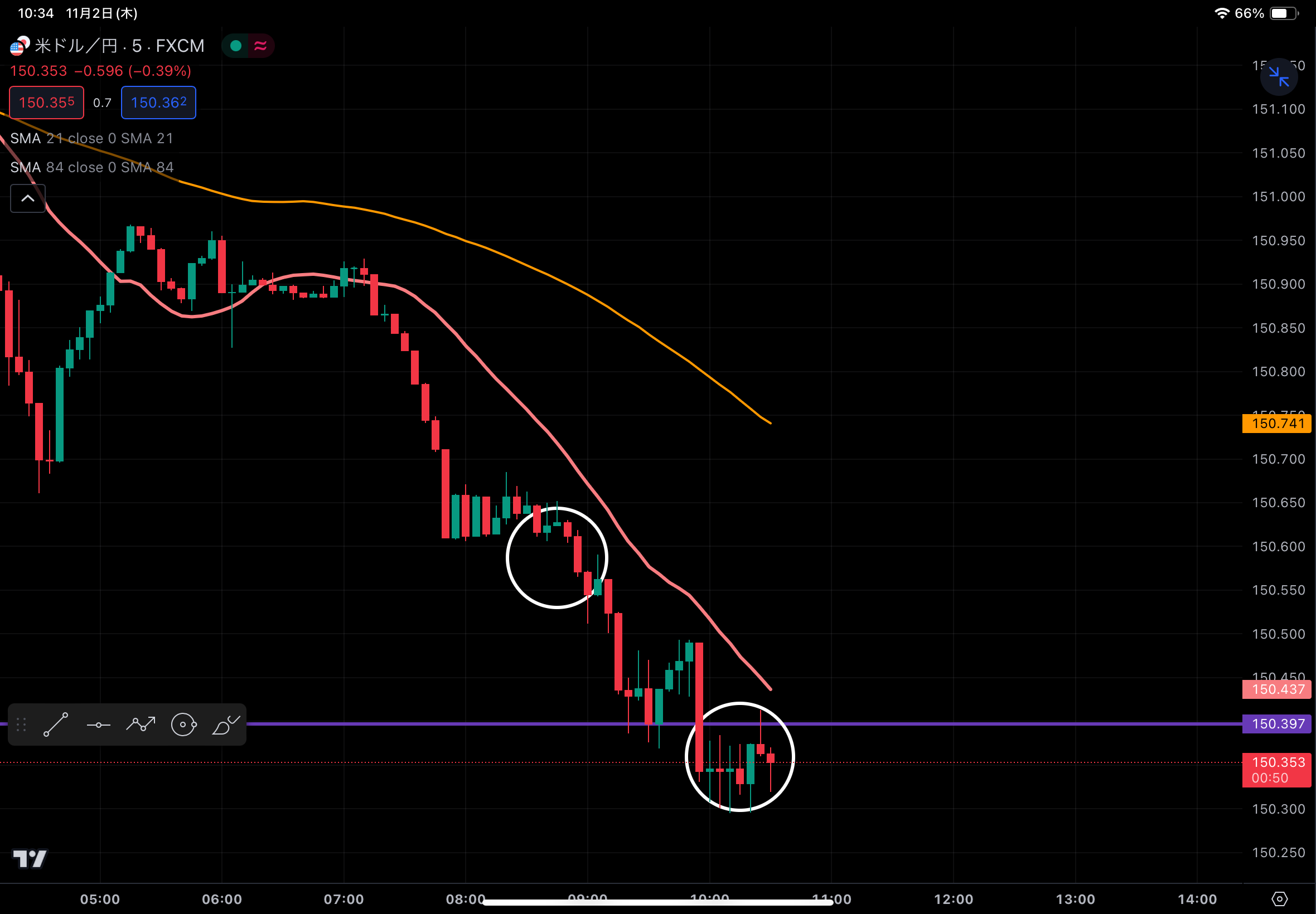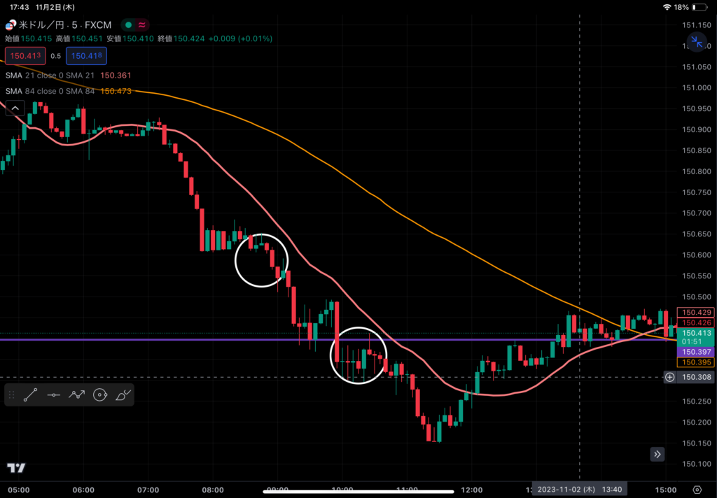 151.600円付近にショートで開始。環境認識から、ポジションをとる根拠。また、21日移動平均線から下降が開始するタイミングにポジションを取ったこのタイミングは間違いなかった。