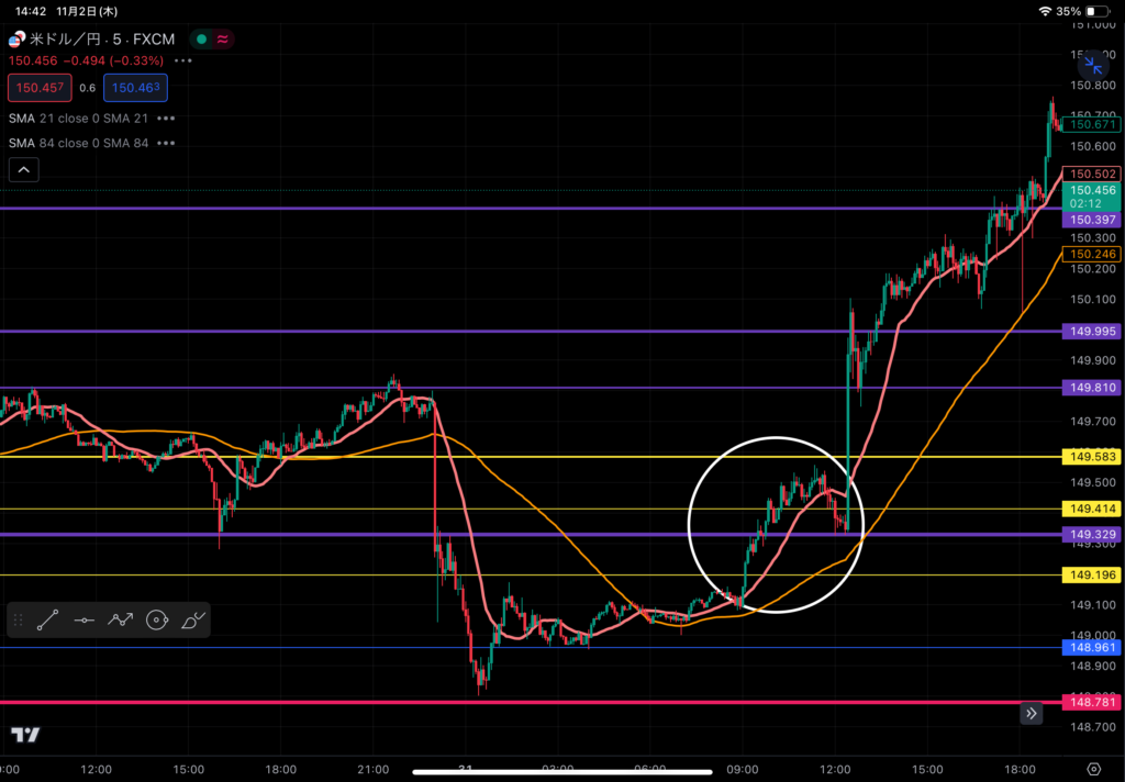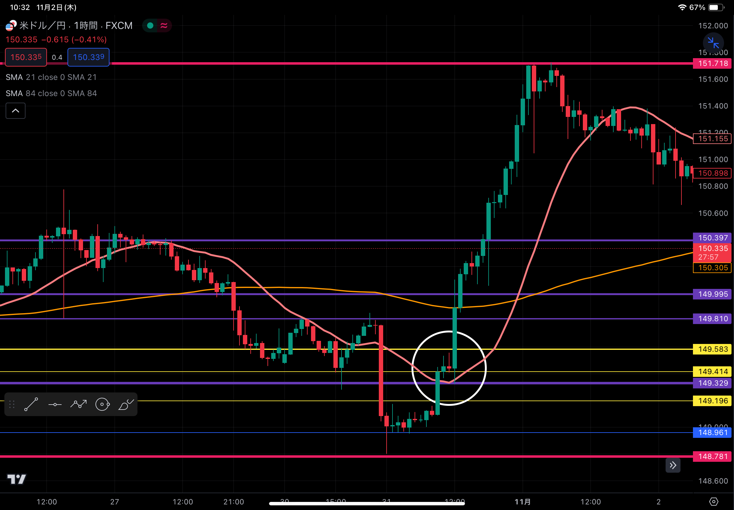 今回は、ポジションを持ってから、プラス1万程の利益を含んでいたけど、上位足の149.300付近は上位足で過去に反転もしているところだし、84日移動平均線が近づいてきているタイミングでかなり強いサポートになっていると考えられる。この場合は、一旦利確するのが得策。